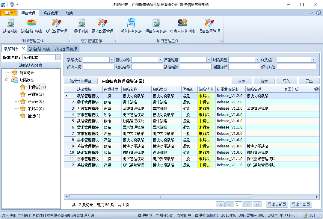 該軟件的功能包括:缺陷的維護管理(可上傳圖片)、項目列表維護、模塊列表維護、版本列表維護(數據字典維護(缺陷狀態、缺陷類型、緊急程度、優先級)、用戶及功能權限管理、機構數據權限管理等功能。軟件能夠規范項目開發過程中的缺陷記錄跟蹤流程、能夠根據不同的角色和機構分配不同的缺陷,極大提高項目開發及管理水平。軟件界面美觀大方,方便使用。
